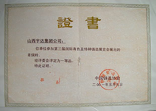 榮獲第三屆國際有色及特種鑄造展覽會一等獎