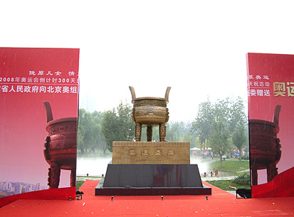 2007年10月13日,北京奧運(yùn)會(huì)倒計(jì)時(shí)300天,北京朝陽(yáng)公園里彩旗飄飄,彩球高懸,到處洋溢著歡慶的氣氛。上午10時(shí),由國(guó)家文化產(chǎn)業(yè)示范基地山西宇達(dá)集團(tuán)精心鑄造、甘肅省人民政府贈(zèng)送給北京奧組委的青銅《奧運(yùn)盛鼎》在這里舉行隆重的捐贈(zèng)揭幕儀式。著名歌唱家郭蓉的一曲《紅旗飄飄》把整個(gè)活動(dòng)推向高潮。北京奧組委執(zhí)行副主席蔣效愚,甘肅省副省長(zhǎng)馮健身以及300名大學(xué)生奧運(yùn)志愿者和千余名熱心中外觀眾參加了揭幕慶典。北京奧組委執(zhí)行副主席蔣效愚在致辭中說(shuō),《奧運(yùn)盛鼎》的捐贈(zèng)活動(dòng)有益于彰顯中華民族燦爛文化,弘揚(yáng)奧林匹克精神,展示中國(guó)改革開放、國(guó)泰民安的良好形象,表達(dá)了全國(guó)各族人民關(guān)心、支持北京奧運(yùn)會(huì)的美好心愿?!秺W運(yùn)盛鼎》將臨時(shí)安放在朝陽(yáng)公園西門內(nèi)的霧泉廣場(chǎng),奧運(yùn)會(huì)開幕前將遷至奧林匹克中心區(qū),成為區(qū)中的獨(dú)特景觀。中央電視臺(tái)等各大媒體紛紛報(bào)道……巍巍青銅重器,見證著中華百年奧運(yùn)夢(mèng)圓,也見證著華夏兒女對(duì)百年奧運(yùn)的熱切期盼。這一堪稱經(jīng)典的2008奧運(yùn)會(huì)主題青銅禮器震撼著人們的心。