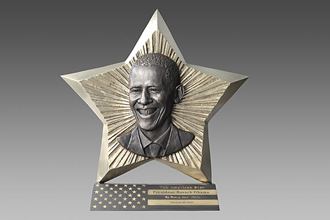 ??? 中國著名雕塑家黃劍女士受美國華人全國委員會邀請,參加了2013年1月20日在華盛頓舉辦的總統(tǒng)府歡迎晚宴和2013年1月21日在華盛頓國會山舉行的美國連任總統(tǒng)奧巴馬的公眾就職典禮,并在這兩次活動上展出了雕塑新作《美國之星——奧巴馬總統(tǒng)》。這件雕塑精品由宇達集團采用白銅精心鑄造,底座采用獨特的蝕刻工藝制作完成。